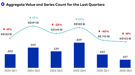 Em relação ao mercado de debêntures, foi registrada a emissão de 391 séries com uma captação total de BRL 155 Bi no período de janeiro a junho de 2025, queda percentual de 56% quando comparado ao mesmo período do ano anterior, enquanto isso, a emissão de notas comerciais registra aumento de 47% em relação ao primeiro semestre do ano anterior, com R$ 28 bi emitidos em 73 séries. No mercado de securitização, foi registada a emissão de 236 séries de CRI/CRA/CR com uma captação total de BRL 28 bi, apresentando uma diminuição de 50% em relação ao mesmo período do ano anterior.