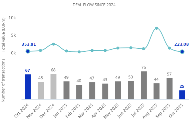 Em outubro, foram registadas 25 fusões e aquisições, entre anunciadas e encerradas, e um valor total de EUR 223,08m.