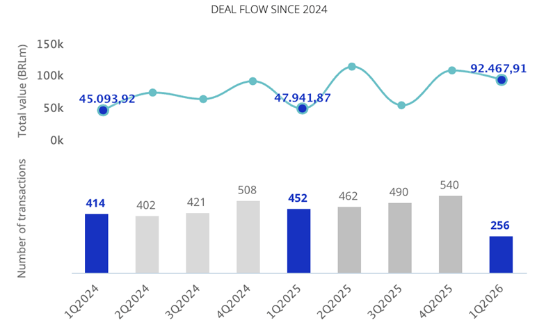 O cenário transacional brasileiro foi objeto de análise no relatório trimestral do TTR Data, que revelou 256 transações movimentando um total de BRL 92,4bi em 2026.